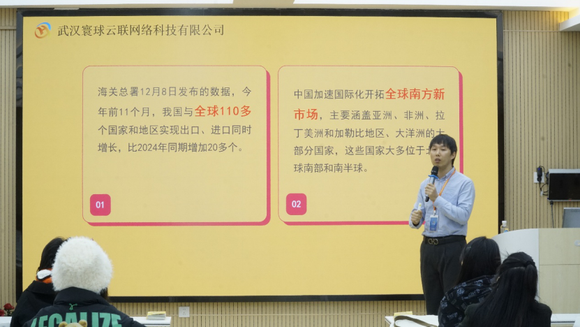 本次分享由武汉寰球云联人事经理何格主讲,聚焦三大核心板块展开。何经理结合最新行业数据,深度解读“十五五”时期跨境贸易发展新动向,系统介绍北美、欧洲、东南亚等核心市场潜力及热销类目趋势;随后阐释企业全球布局、自有品牌孵化及海外仓建设情况,重点剖析行业对多语言沟通、跨文化理解等外语类人才的迫切需求;最后从简历优化、面试筹备、岗位匹配等维度提供实操指导,鼓励学子结合自身优势精准规划职业方向。