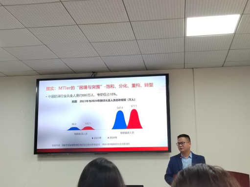 金新老师在讲座中精准把握了同学们最关切的问题,并对MTIer所面临的困境及其应对策略进行了深入分析。金老师指出,实现破局的核心在于从两个维度着手:即清晰的自我认知与科学的职业规划。他进一步阐明,新时代复合型外语人才的培养路径应是:语言+技术+文化+战略思维的有机结合。同时还重点介绍了AI技术如何重塑语言职业服务,催生出五种新的职业角色,为MTI学子的未来就业开辟了新的前景。